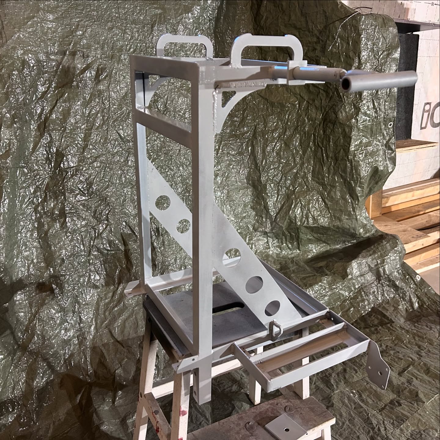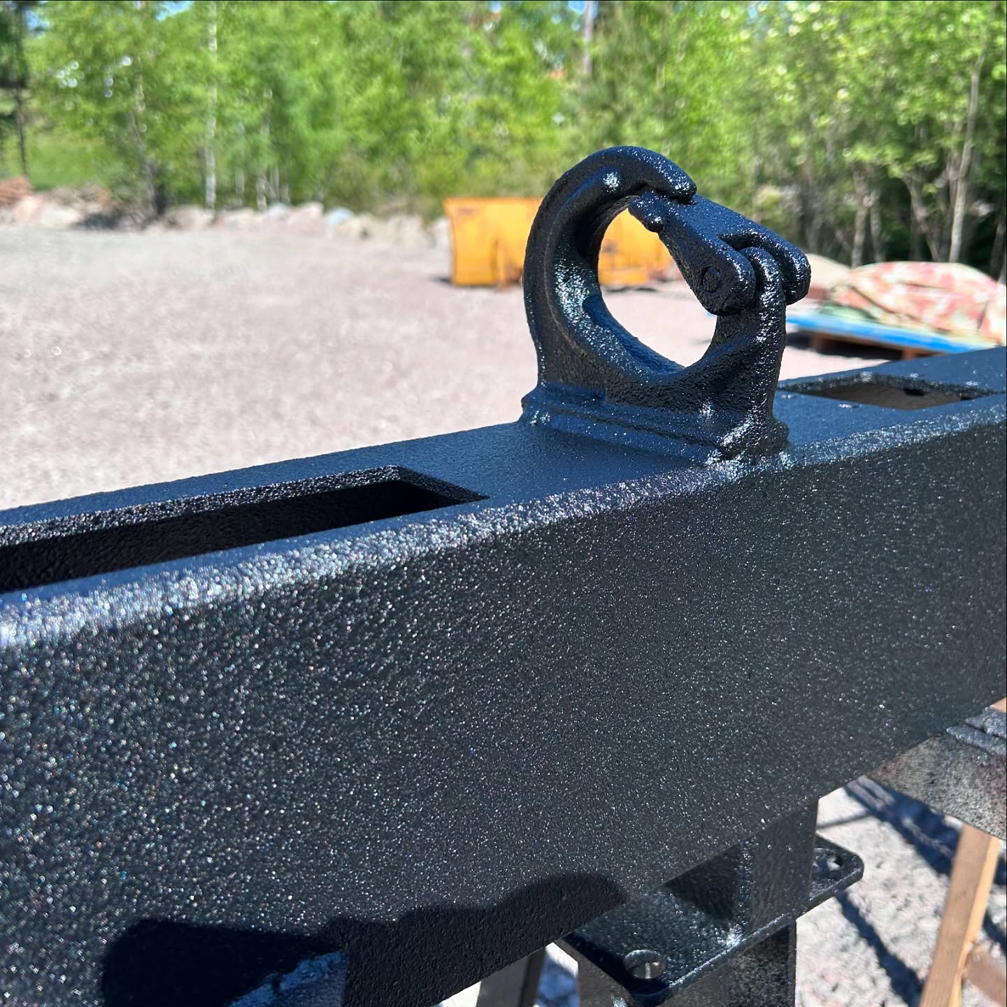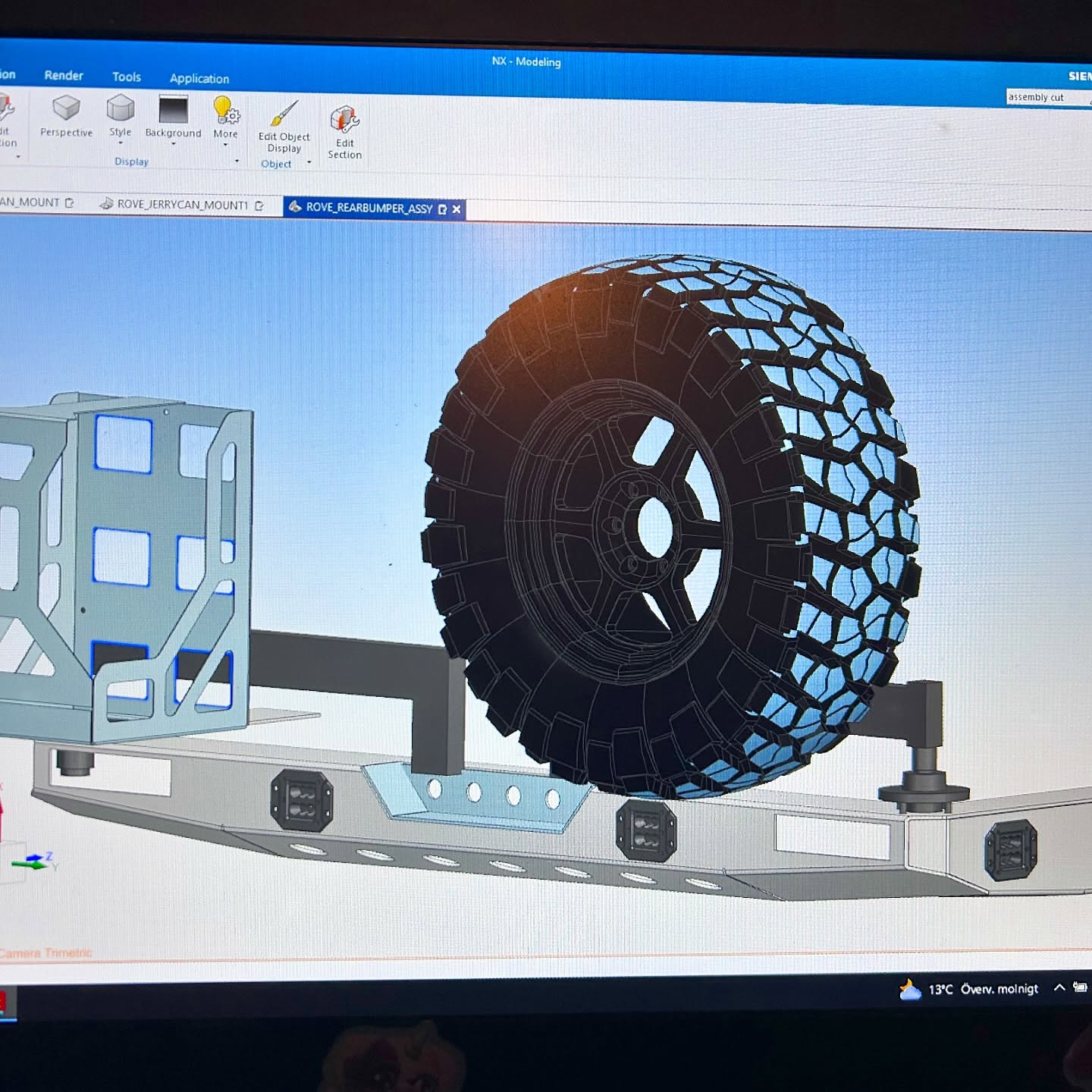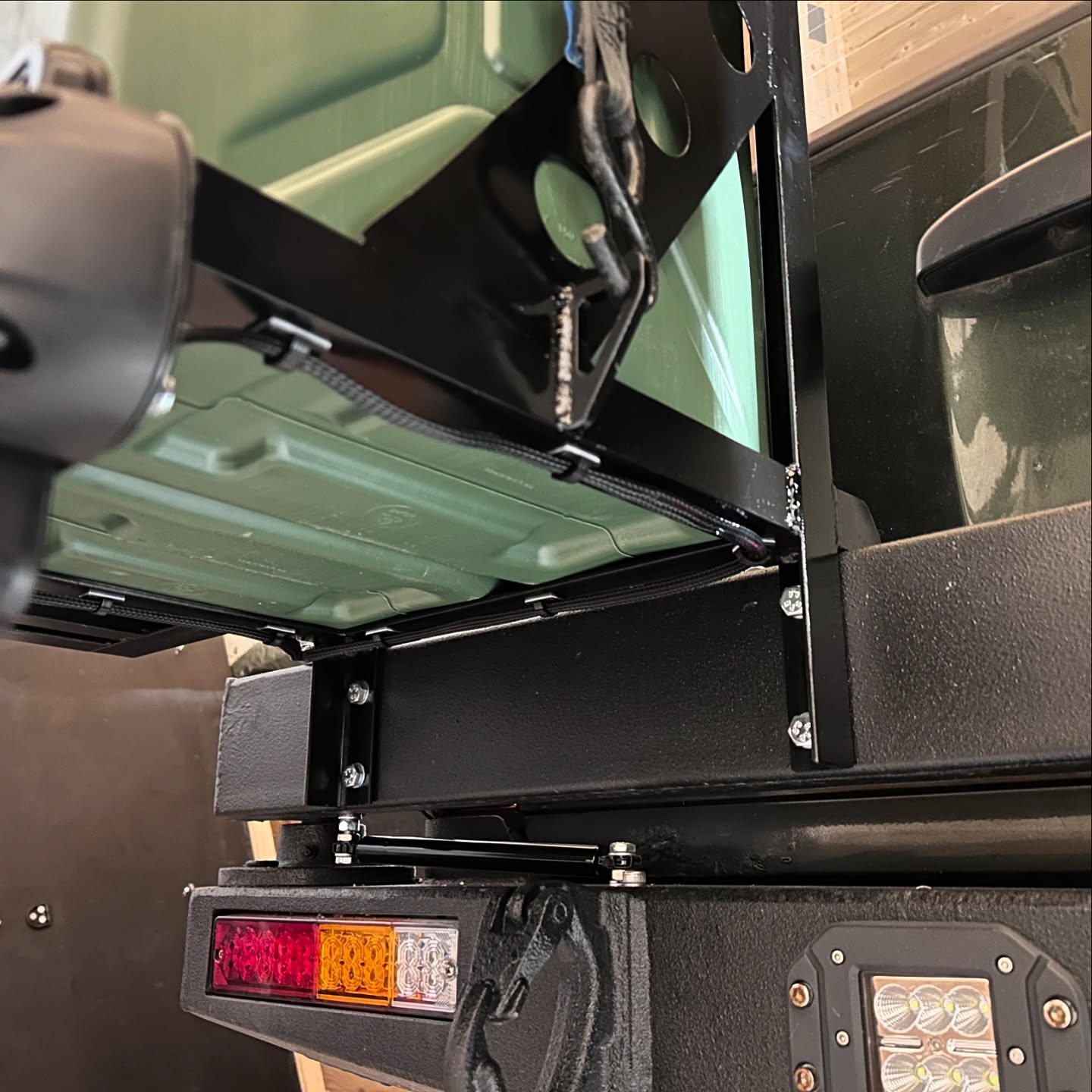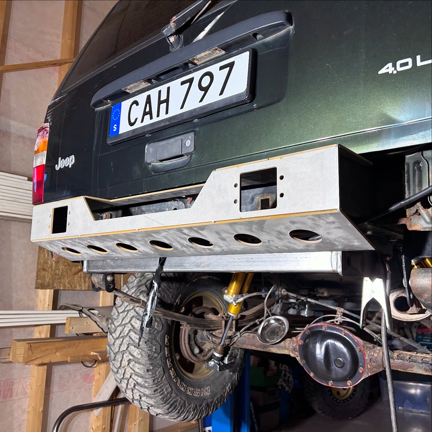 Att få med sig all utrustning och packning som behövs på en längre resa är alltid en utmaning. Därför ritade vi upp en kofångare med dubbla utsvängbara armar med fäste för reservhjul, bränsledunkar, sandstegar mm för att frigöra utrymme inuti bilen. I kofångaren fällde vi in backljus/arbetsljus, blinkers, position, broms samt reg-skyltshållare med belysning. Kofångaren lackades i bedliner för att klara ett tufft klimat och användande.